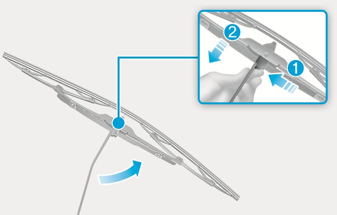 While pushing the lock (1), pull down the wiper blade (2).