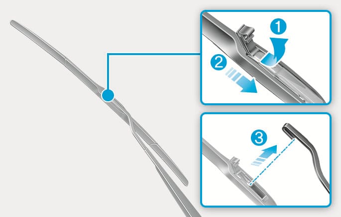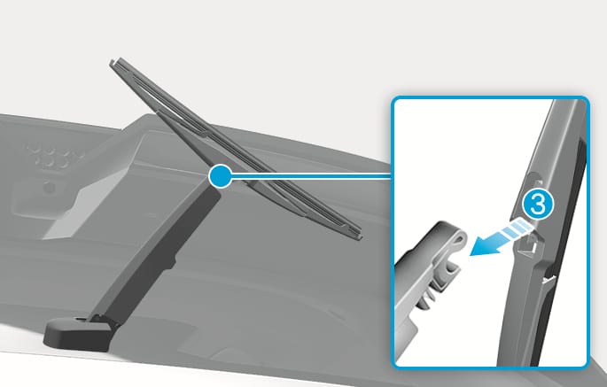 Lift up the wiper blade clip (1). Then pull down the wiper blade (2) and remove the wiper blade from the wiper arm (3).
