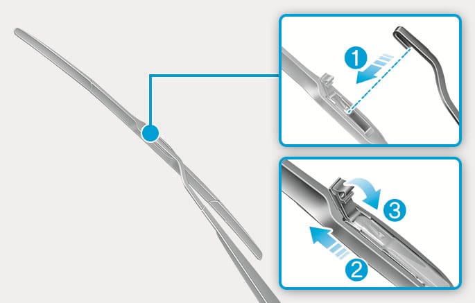 Install the new blade assembly by inserting the center part into the slot in the wiper arm until it clicks into place (3).
