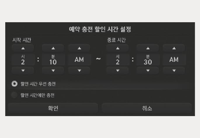 다음 지시에 따라 전기 요금 할인 시간대와 예약 충전 옵션을 설정하십시오.