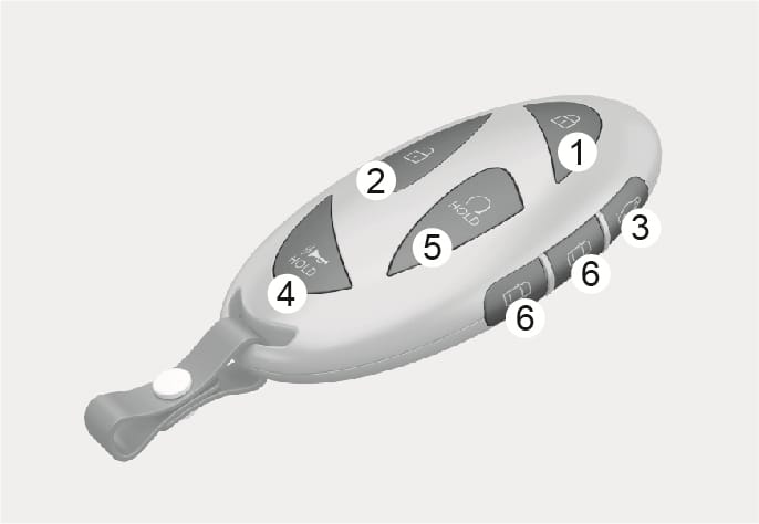 스마트 키의 트렁크 열림/닫힘 버튼(3)을 1초 이상 길게 누르십시오. 트렁크가 열리고, 비상 경고등이 2회 깜빡입니다.