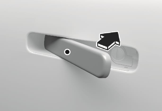 스마트 키를 휴대하고 앞좌석 도어의 바깥쪽 도어 핸들에 있는 도어 잠금/잠금 해제 센서부(음각 부분)를 터치하면 도어의 바깥쪽 핸들이 들어가고 모든 도어가 잠금 상태가 됩니다.