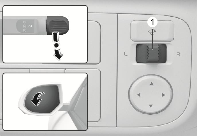 시동 'ACC', 'ON' 또는 시동이 걸린 상태에서 미러 조절 레버(1)를 움직여 L(운전석) 또는 R(동승석)을 선택하십시오.