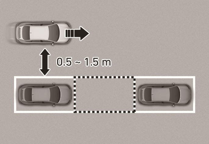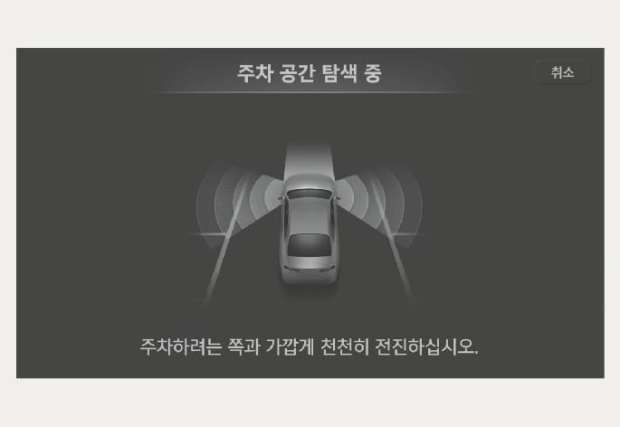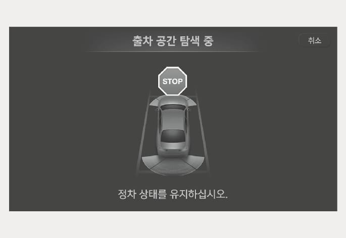 브레이크 페달을 밟아 정차한 상태에서 차량 센서로 주변 물체와의 거리를 감지하여 평행 출차 가능한 공간을 탐색합니다.