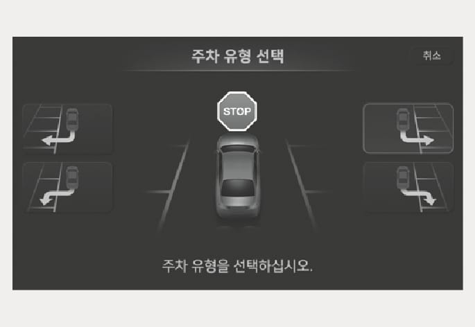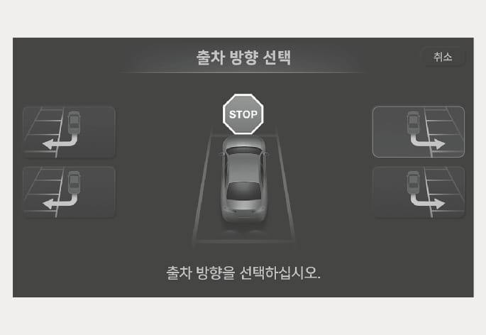 브레이크 페달을 밟아 정차한 상태에서 인포테인먼트 시스템 화면을 터치하여 원하는 출차 방향을 선택하십시오.