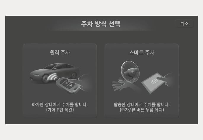 원격 스마트 주차 보조에 의한 평행 주차 완료 후에 원격 스마트 주차 보조를 다시 켰을 경우 스마트 출차 기능을 사용할 수 있습니다.