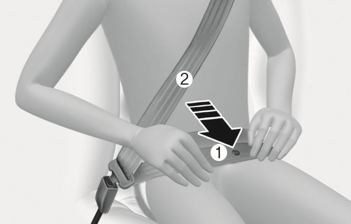 Pull the seat belt out of the retractor and insert the metal tab (1) into the buckle (2). An audible "click" sounds when the tab locks into the buckle. Make sure the seat belt is not twisted.