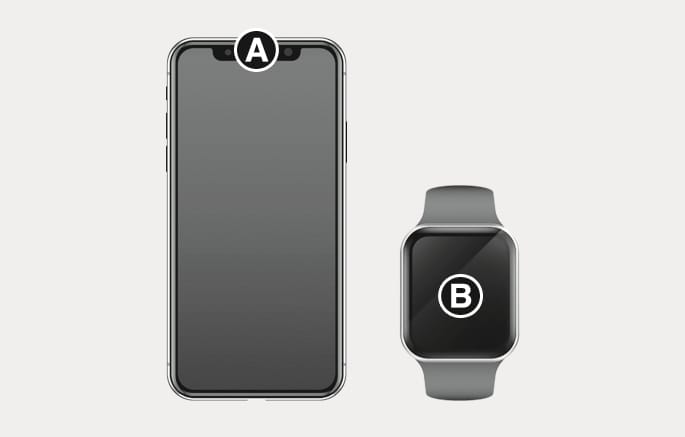 Apple iphone의 NFC 안테나는 기기 후면 최상단[A], Apple WATCH의 NFC 안테나는 화면 중앙[B]에 위치합니다.