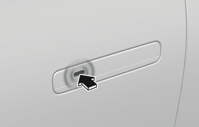 스마트 키를 휴대한 상태로 동승석 측 바깥쪽 도어 핸들의 도어 잠금/잠금 해제 센서부(음각 부분)를 터치하십시오.