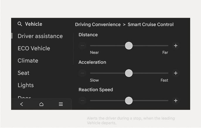 Con el vehículo encendido, seleccione Ajustes > Vehículo > Asistencia al conductor > Comodidad durante la conducción > SCC (control inteligente de velocidad) en el menú Ajustes del sistema de infoentretenimiento para cambiar manualmente la distancia, la aceleración y la velocidad de reacción.