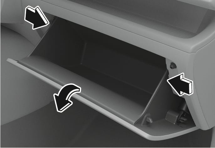 Retire los topes de ambos lados para que la guantera cuelgue libremente de las bisagras.