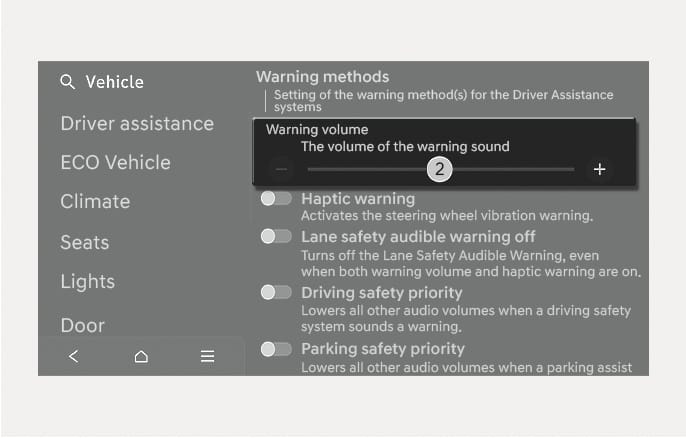 Volumen de aviso: Seleccione Ajustes > Vehículo > Asistencia al conductor > Métodos de aviso > Volumen de aviso en el menú Ajustes del sistema de infoentretenimiento con el motor encendido para cambiar el volumen de aviso.