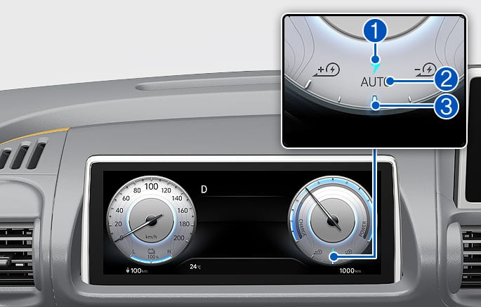 스마트 회생 시스템이 켜지면 클러스터에 'AUTO' 문구가 표시되고, 작동 조건에 따라 회생 제동량이 조절됩니다.