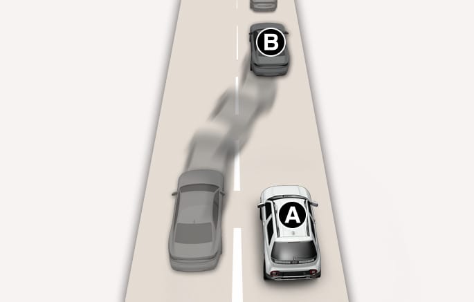 상대 차량[B]이 차로를 변경해 운전자 차량[A] 앞으로 끼어드는 경우, 센서의 감지 범위에 진입하기 전까지 합류 차량의 인식이 지연될 수 있으므로 주의하십시오.