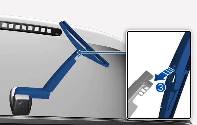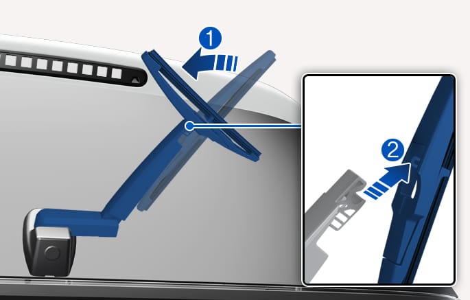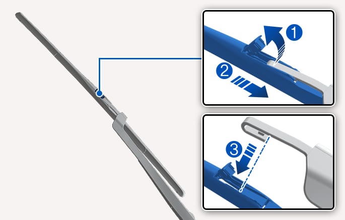 새 와이퍼 블레이드를 와이퍼 암에 끼운 후(1) 블레이드를 위로 밀어 고정하고(2) 잠금 커버를 닫으십시오(3).