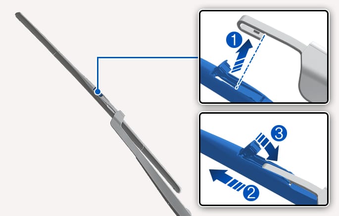 잠금 커버를 열고(1) 블레이드를 아래로 당긴 후(2) 와이퍼 암으로부터 분리하십시오(3).
