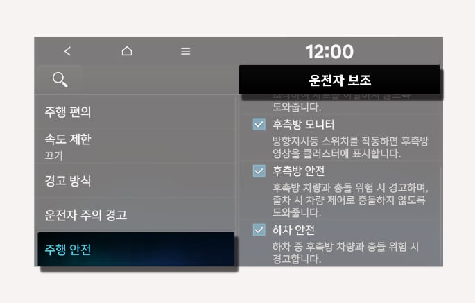 후측방 충돌방지 보조을 사용하시려면 시동 'ON' 상태에서 인포테인먼트 시스템의 설정 > 차량 > 운전자 보조 > 주행 안전을 차례로 선택하십시오.