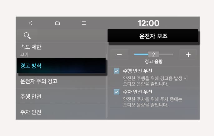 주행 안전 우선: 안전한 주행을 위해 경고음 발생 시 오디오 음량을 줄입니다.