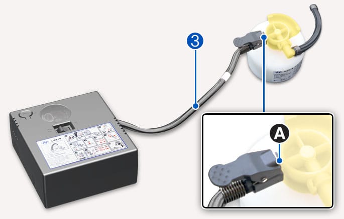Sluit de vulslang (3) aan op de aansluiting [A] van de fles afdichtmiddel en zet deze vast. Plaats de fles afdichtmiddel met de vulslang naar boven.
