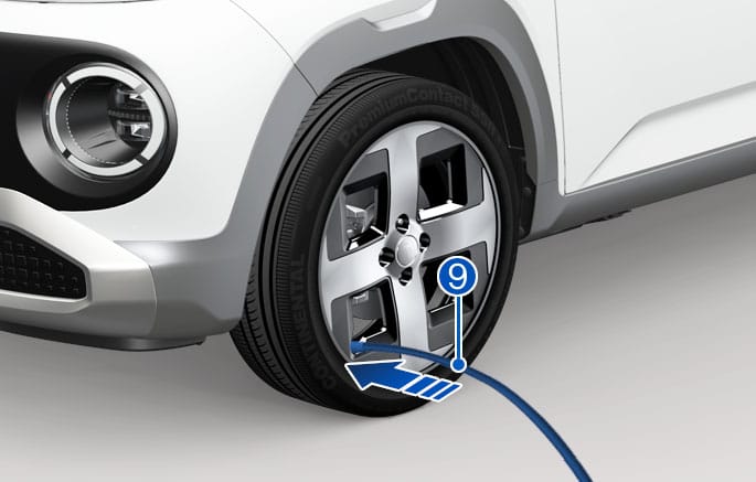 Schroef het ventieldopje van de beschadigde band los en sluit de injectieslang met afdichtmiddel (9) aan op het ventiel van de band.