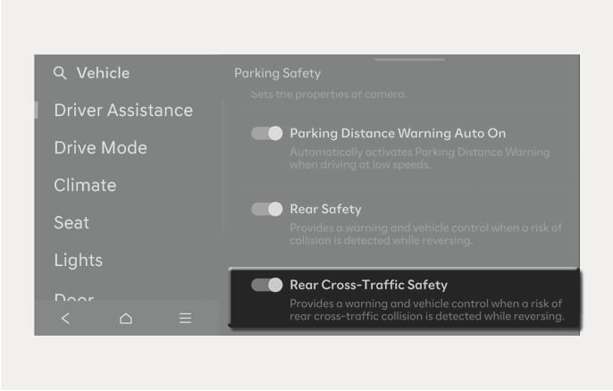 When the vehicle is restarted, Rear Cross-Traffic Collision-Avoidance Assist always turn on. However, if 'Off' is selected after the vehicle is restarted, the driver should always be aware of the surroundings and drive safely.