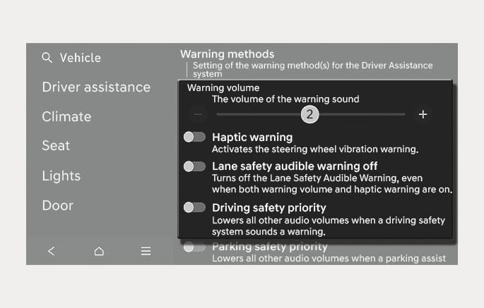 Both Warning volume and Haptic warning settings should be turned on status to set the Lane safety audible warning off.