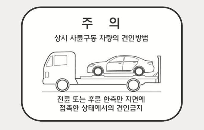 4WD(사륜구동) 차량은 일반 견인 트럭으로 견인할 수 없습니다. 반드시 사륜을 들어 올려 견인하십시오.