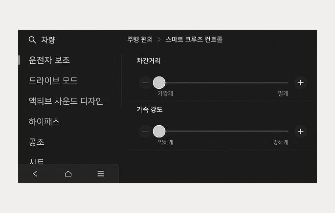 시동 ‘ON’ 상태에서 인포테인먼트 시스템의 설정 > 차량 > 운전자 보조 > 주행 편의 > 스마트 크루즈 컨트롤을 차례로 선택하십시오. 차간거리, 가속 강도, 반응 속도를 개별적으로 설정할 수 있습니다.