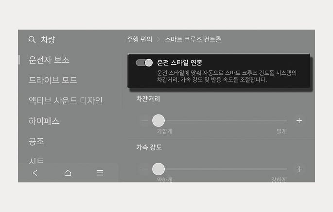 운전 스타일 연동을 지원하는 경우에만 인포테인먼트 시스템의 설정 > 차량 > 운전자 보조 >주행 편의 > 스마트 크루즈 컨트롤 메뉴에서 운전 스타일 연동을 선택할 수 있습니다.