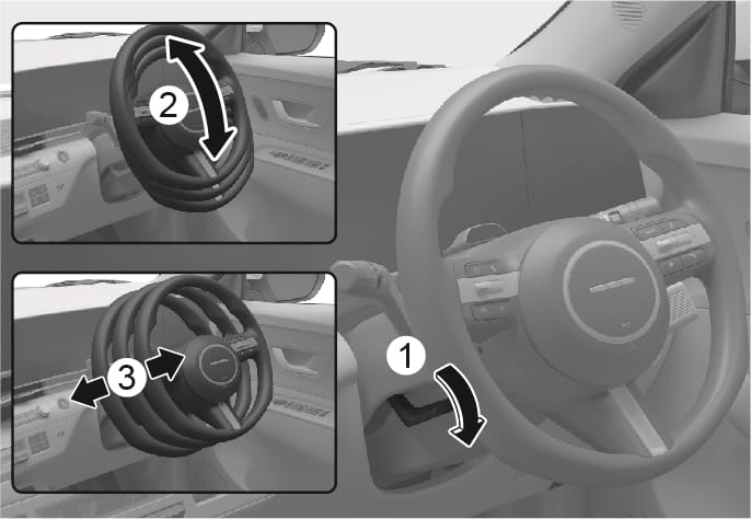 Adjust the steering wheel to the desired angle (2) and distance forward/back (3).
