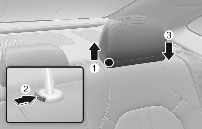 내릴 때는 잠금 해제 버튼(2)을 누른 상태에서 헤드레스트를 아래로 누르십시오(3).