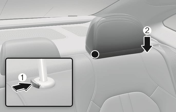 뒷좌석 헤드레스트 잠금 해제 버튼(1)을 눌러 뒷좌석 헤드레스트를 최대한 아래로 내리십시오(2).