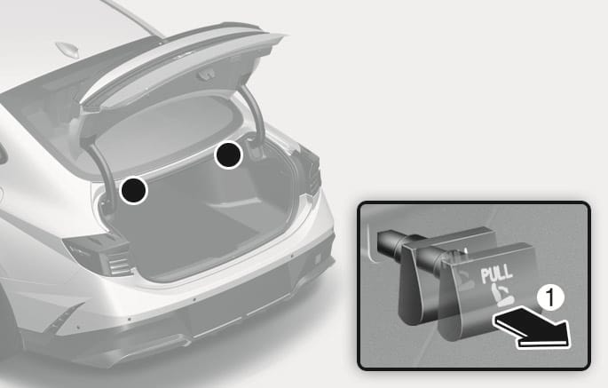트렁크를 열고 좌석 접이 레버(1)를 당긴 상태에서 등받이를 앞으로 접으십시오.