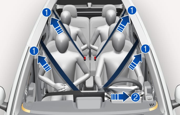 Wenn das Fahrzeug stark abgebremst wird oder wenn ein Insasse versucht, sich zu schnell nach vorn zu beugen, rastet die Gurtrolle ein. Bei bestimmten Frontal- oder Seitenaufprallen wird der Gurtstraffer aktiviert und zieht den Sicherheitsgurt fester an den Körper des Insassen heran.