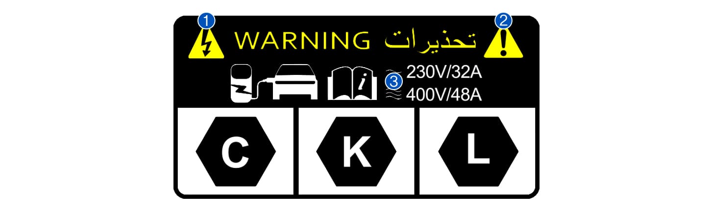 Open de oplaadklep en controleer de informatie op het oplaadlabel. Op het laadetiket staan veiligheidssymbolen en de nominale ingangsspecificaties voor het laden.