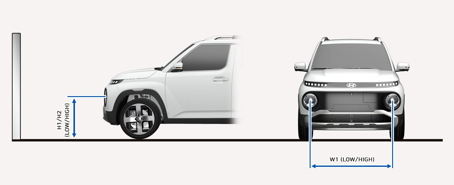 - W1: Afstand tussen de twee middelpunten van de koplampen (dimlicht/grootlicht)