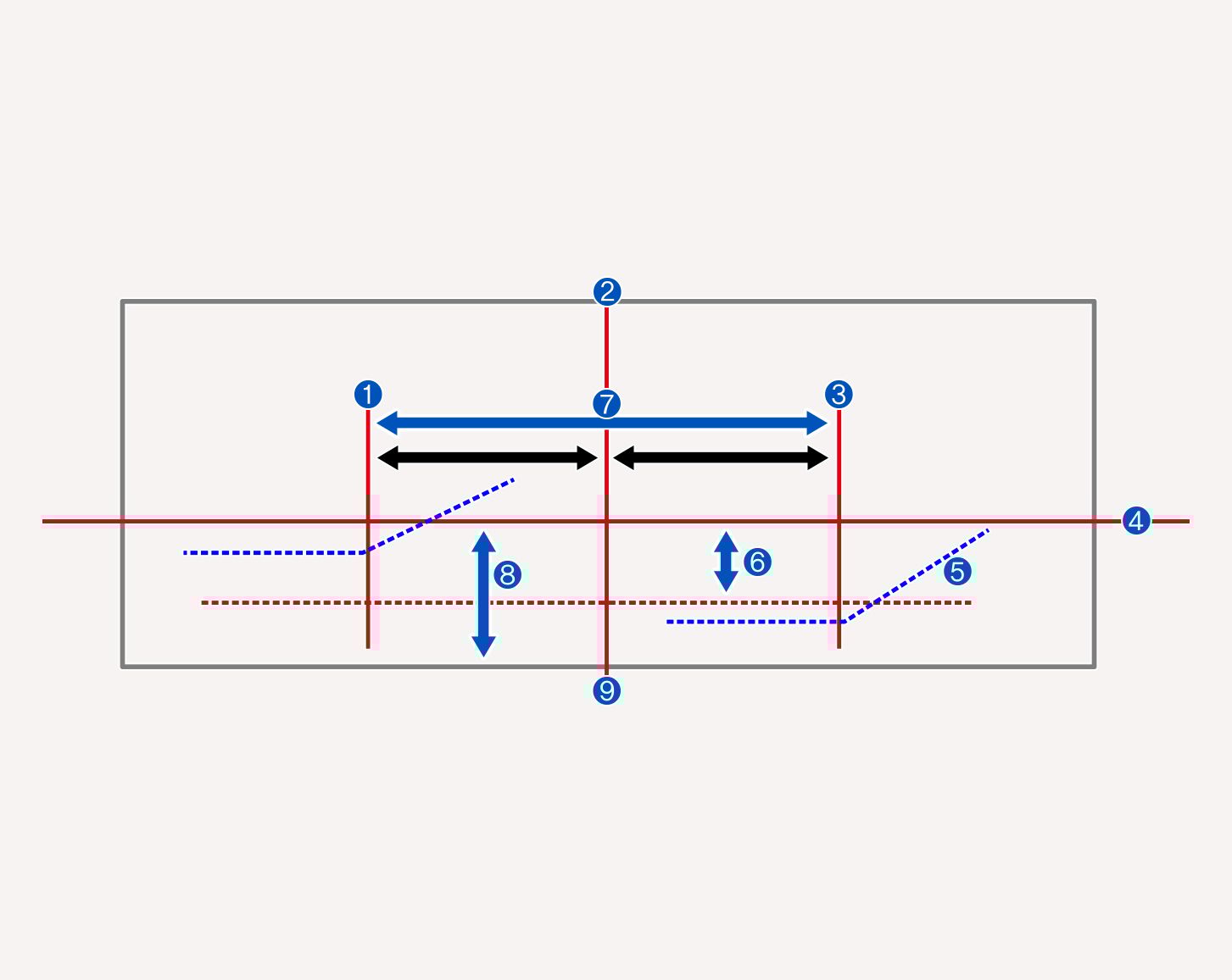 Trek verticale lijnen (lijnen die door het hart gaan van de respectievelijke koplamp) en een horizontale lijn (die door het hart gaat van de koplamp) op het scherm.