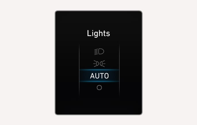 U kunt de displayfunctie Ruitenwisser/Lichten activeren of deactiveren in de instrumentengroep of het infotainmentsysteem. Selecteer Instrumentenpaneel > Ruitenwisser/lichtweergave in de instrumentengroep of Instrumentenpaneel > Inhoudselectie > Ruitenwisser/lichtweergave in het infotainmentsysteem.