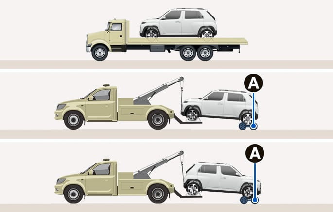 Als er een takelwagen nodig is, til dan alle wielen op om de auto weg te slepen. Wegslepen met de wielen op de grond kan de motoronderdelen van de auto beschadigen.