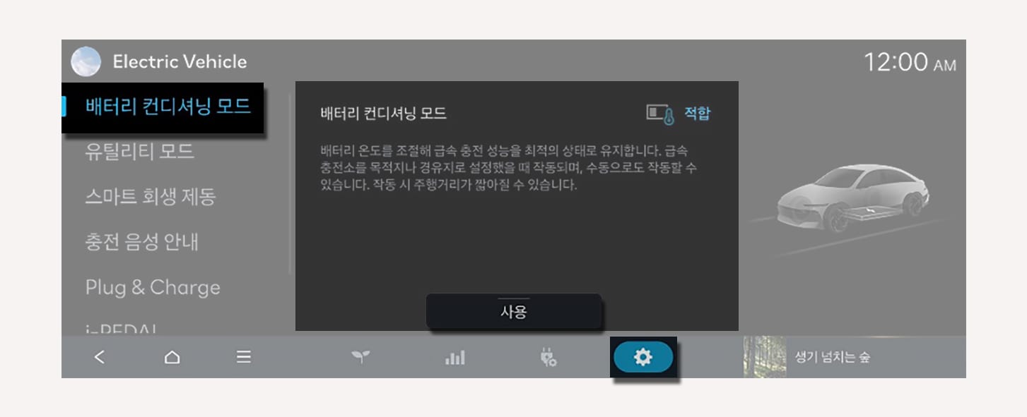 EV 설정 화면에서 배터리 컨디셔닝 모드, 유틸리티 모드 등 전기차에 특화된 다양한 기능을 설정할 수 있습니다.