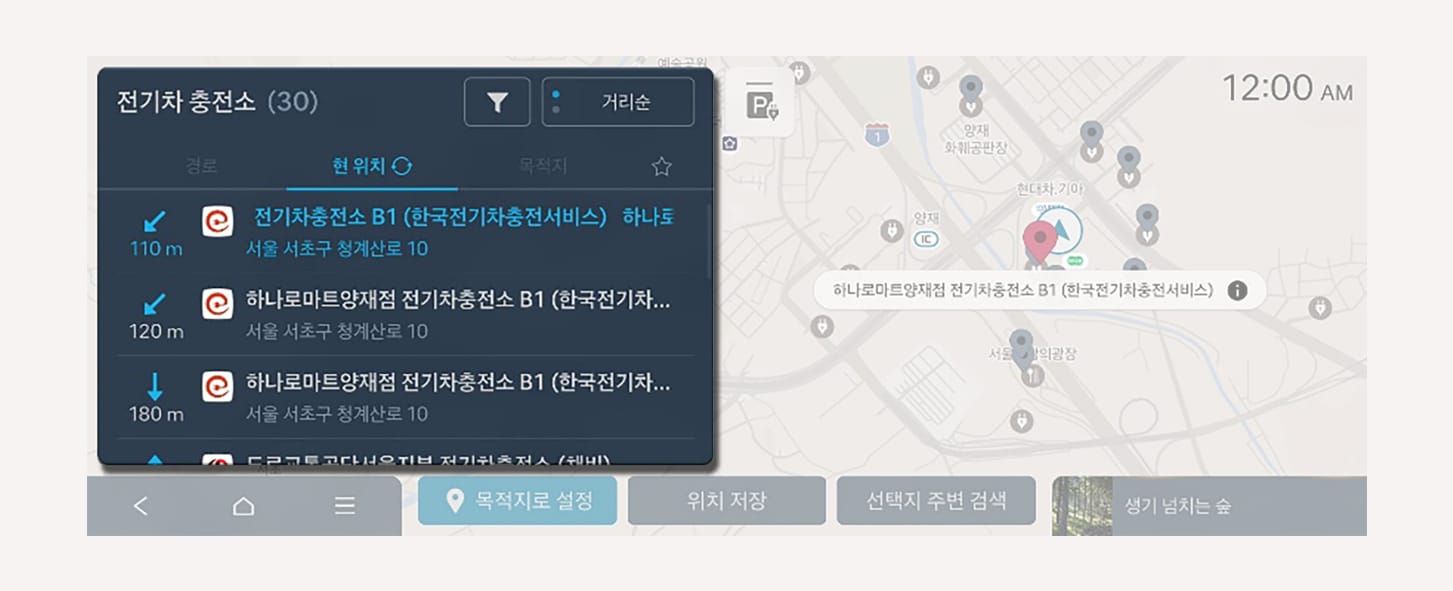 선택한 옵션에 해당하는 충전소들의 방향(좌/우), 거리, 충전기 종류, 주소, 지도상 위치가 화면에 표시됩니다.