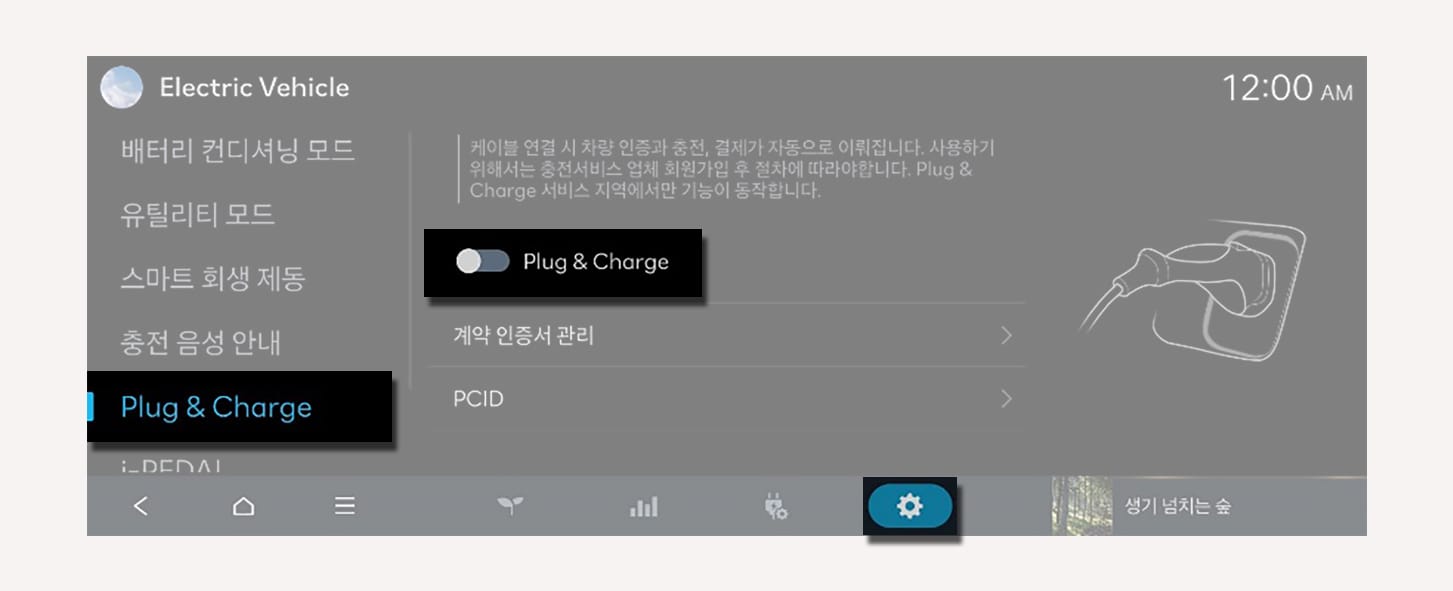 계약을 체결하지 않은 경우 Plug & Charge 기능을 꺼 두는 것이 좋습니다. 계약 체결 없이 Plug & Charge 기능을 켜 두는 경우 충전 진행 중 문제가 발생할 수 있습니다.