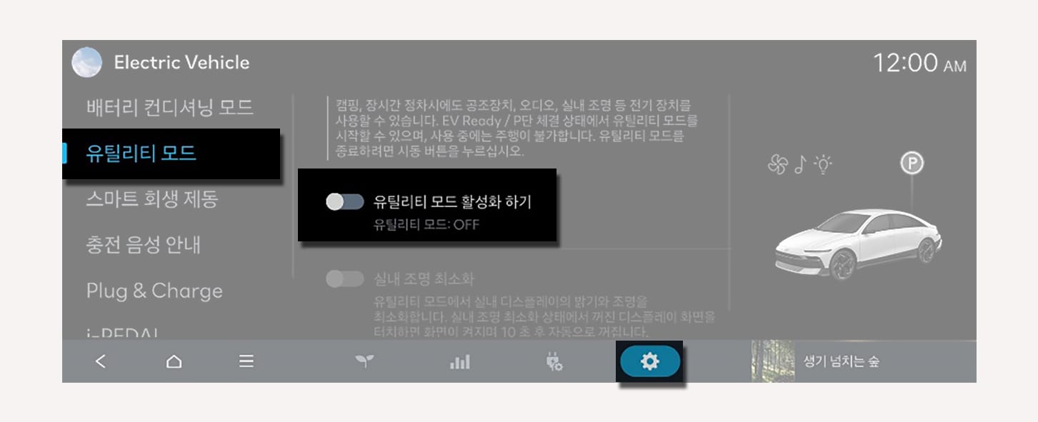 Ĵ (EV 설정) > 유틸리티 모드를 선택한 후 유틸리티 모드 활성화 하기를 눌러 기능을 켜십시오.