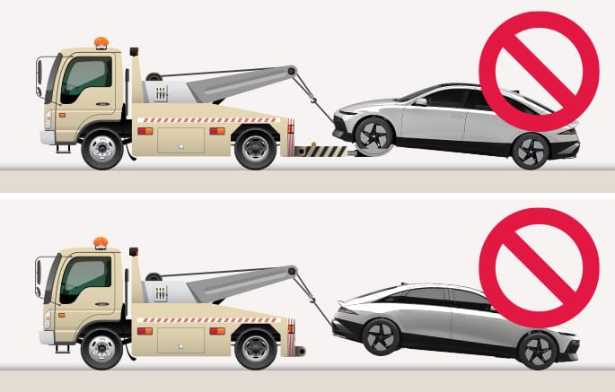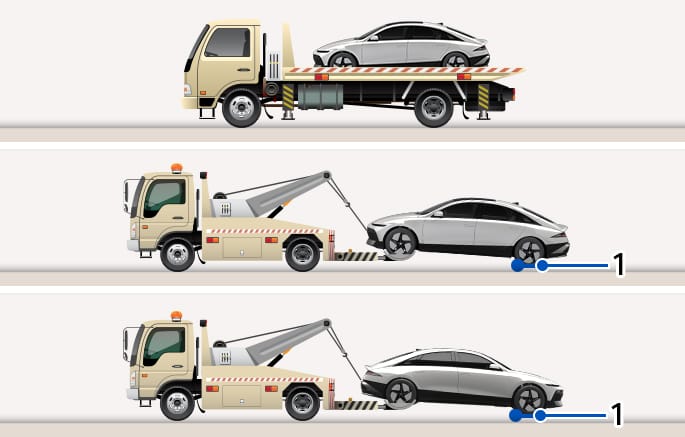 전기차를 견인해야 하는 경우 모든 바퀴를 들어올려 견인하십시오. 바퀴가 지면에 닿은 상태로 견인하는 경우 구동 부품이 손상될 수 있습니다.