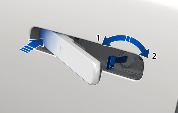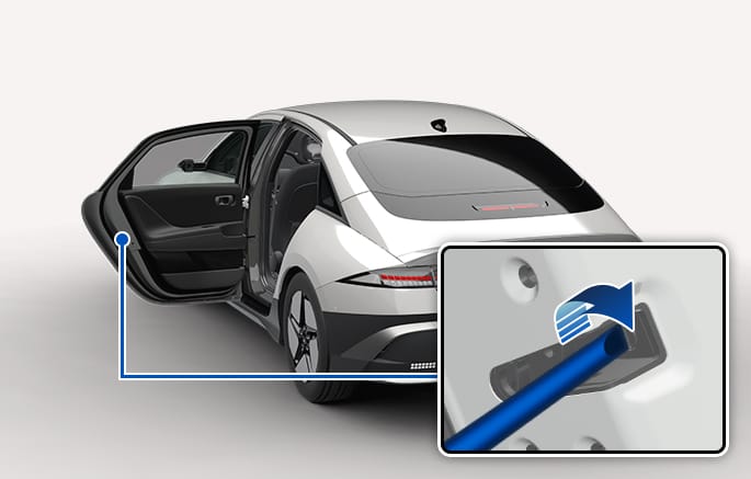 도어 잠금 해제된 상태에서 배터리가 방전되어 핸들이 튀어나오지 않고 수납돼 있는 경우, 도어 핸들의 앞부분(차량 전면 방향)을 눌러 핸들이 수동으로 튀어나오게 한 다음 충분히 잡아 당기면 도어를 열 수 있습니다.