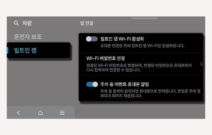 빌트인 캠 Wi-Fi 활성화: 스마트폰 앱 연결에 사용되는 Wi-Fi 기능을 켜거나 끌 수 있습니다.