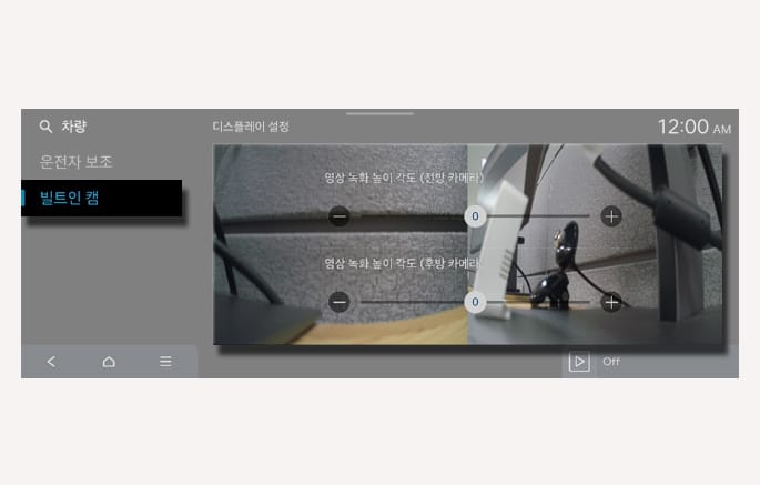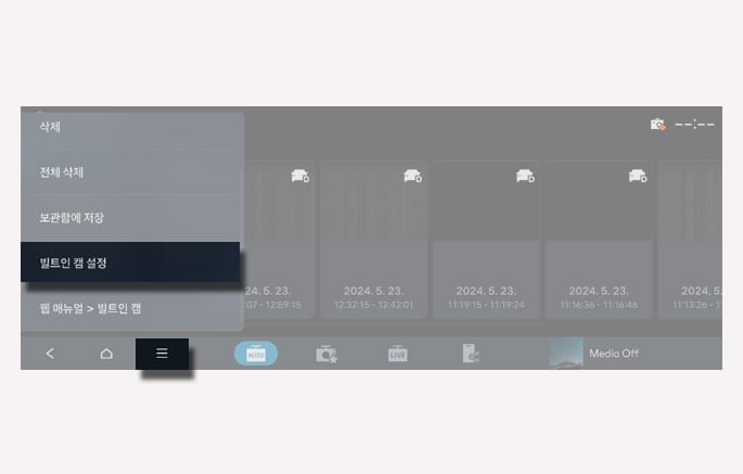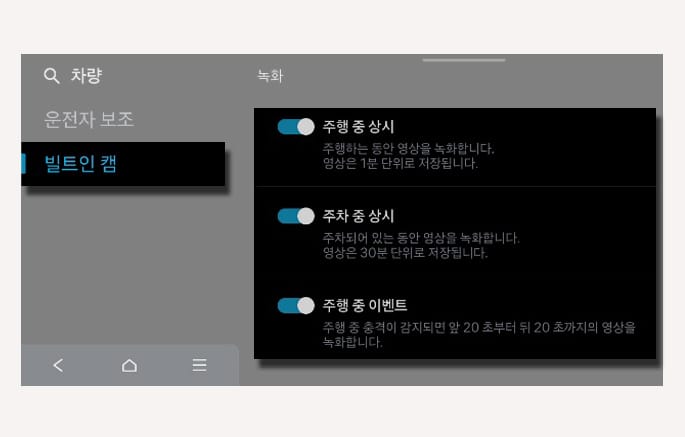 또는 인포테인먼트 시스템의 설정 > 차량 > 빌트인 캠을 차례로 선택하십시오. 빌트인 캠 녹화를 포함하여 작동과 관련된 다양한 항목을 설정할 수 있습니다.