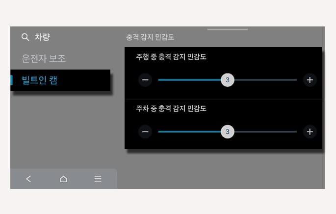 주행 및 주차 중 이벤트 녹화 여부의 기준이 되는 충격 감지 민감도를 선택할 수 있습니다. 1단계(매우 둔감), 2단계(둔감), 3단계(보통), 4단계(민감), 5단계(매우 민감) 중에 원하는 감지 조건을 선택하십시오.