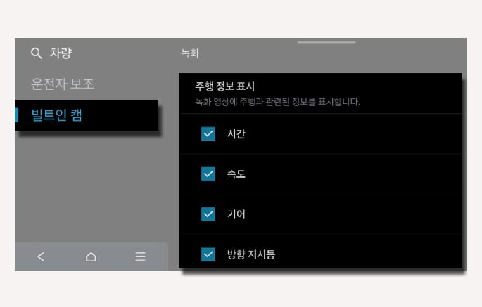 빌트인 캠 영상에 다양한 주행 정보를 기록할 수 있으며, 주행 정보 표시 메뉴에서 원하는 항목을 선택할 수 있습니다.