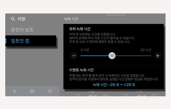 주차 녹화 시간: 주차 후 녹화를 유지할 시간을 설정할 수 있습니다. '주차 녹화 시간'은 최대 20시간까지 설정이 가능합니다.